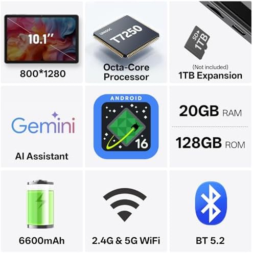 - Ample Storage & Memory - With 128GB of built-in storage—expandable up to 1TB via TF card—this tablet offers abundant space for your movie collections and family photos. Its 20GB LPDDR4 memory (4GB physical + 16GB virtual) enables smooth multitasking and instant content access.