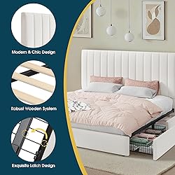 【Ample Storage】Featuring 4 large built-in drawers, this platform bed offers generous space to store clothing, bedding, and more — helping you organize your bedroom neatly and maximize every inch of your room. 【Adjustable Headboard】Customize your comfort with an adjustable headboard that offers two height settings to accommodate mattresses of varying thickness. The cushioned upholstery provides a soft, comfortable support perfect for reading or relaxing. 【Sleek Modern Design】With its clean vertical lines and minimalist silhouette, this bed frame blends seamlessly into any bedroom decor. Its understated elegance adds a touch of contemporary style to your space. 【Strong & Sturdy Construction】Rest easy on a robust frame supported by 12 durable wooden slats. Designed with snap-on fasteners, the slats lock securely into place, ensuring lasting stability and reliable support for a peaceful night’s sleep. 【Easy Assembly】Comes with clear instructions and all the necessary tools for a quick and hassle-free setup. You’ll have your new storage bed assembled and ready to enjoy in no time!