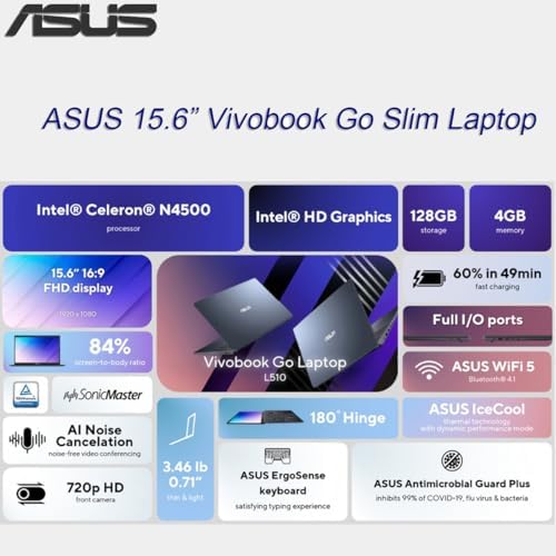 ASUS 15.6” Vivobook Go Slim Laptop, Thin & Portable Laptop for Student Business, Intel Dual Core N4500, 4GB RAM, 128GB SSD, WiFi, Bluetooth, Windows 11 Pro, Star Black