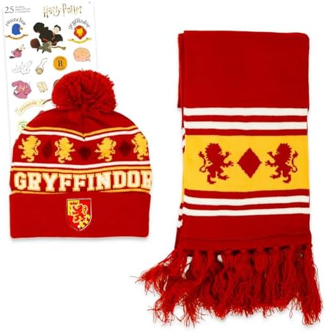Harry Potter Gryffindor Hat and Scarf Set for Kids - Hogwarts House Bundle with Gryffindor Beanie and Scarf Plus Stickers | Harry Potter Winter Gear. This Harry Potter winter accessories set includes a cozy beanie and scarf, both adorned with the Gryffindor crest and colors, ideal for Harry Potter fans and proud Gryffindors. The Harry Potter Gryffindor beanie and scarf provide excellent warmth for cold days, ensuring your child stays comfortable during chilly days at Hogwarts or in the Muggle world. Ideal for birthdays, holidays, or any special occasion, this Harry Potter winter gear set will surely delight any Harry Potter fan. Officially licensed Harry Potter Gryffindor scarf and knit cap set is for all fans, boys and girls alike. This set also includes Harry Potter stickers.