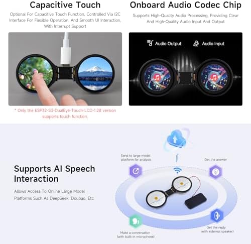 - Dual 1.28-inch LCD Displays: Equipped with dual 1.28-inch LCD displays featuring 240×240 resolution and 65K colors, perfect for creating interactive GUIs, touch-controlled interfaces, and more. Touch functionality is optional for enhanced user experience.