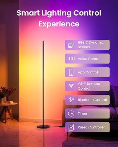 - Personalized Lighting: The LED floor lamp offers 16 million colors, 26 segmented dynamic presets, and 8 effects with one-tap app scenes. Easily create DIY scenes and transform your living room or bedroom into a cinema, gaming den, or party space for immersive ambiance. Enjoy multiple control options including hands-free voice, mobile app, and wired control.