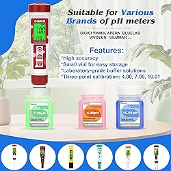 Precisely calibrate your pH meter: The GIDIGI pH calibration kit is comprehensive, meeting all your calibration and maintenance needs. It includes six 50ml bottles of pH calibration buffer (pH 4.00, 7.00, and 10.01) and two 50ml bottles of KCl storage solution for pH electrodes. This kit allows you to perform multi-point calibration and routine maintenance of your pH meter, eliminating the need to purchase additional solutions. Professional pH calibration solution: The pH buffer solution offers laboratory-grade accuracy, reaching ±0.01 pH (at 77°F). This high calibration accuracy delivers professional and reliable results. It is suitable for scientific research, water quality testing, agriculture, and other professional fields. Easy to use: The pH calibration and maintenance solutions are easy to identify and use. The bottles are color-coded (red, blue, and green correspond to pH 4, 7, and 10) for quick identification, effectively avoiding potential errors during calibration and saving time. The solutions are ready for use, eliminating the complicated mixing of calibration powders. Includes electrode storage solution: The pH probe storage solution effectively protects the electrode and extends its life. The included KCl electrode storage solution prevents drying and crystallization of the pH meter's electrode tip, maintaining its sensitivity and accuracy, and saving users long-term replacement costs. Small 50ml bottle design: The product features a double-sealed cap and has a leak-proof, stable, and fresh shelf life of two years in an unopened container. It's easy to carry and suitable for all pH meters with pH calibration.