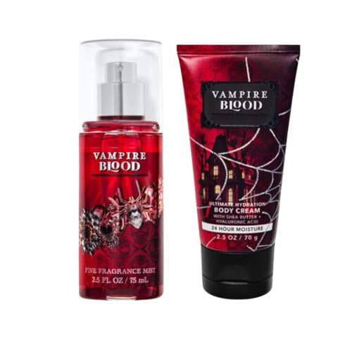 Bath and Body Vampire Blood set of two. 1 - Fine Fragrance Body Spray (2.5 fl oz / 75 mL) & 1 - Vampire Blood Ultimate Hydration Body Cream (2.5 oz / 70 g). What it smells like: equal parts fruity, floral, and frightful. Fragrance notes: red berries, night-blooming jasmine, and petrifying plum. Dermatologist tested. Packaging label design styles may vary. See images for variations in packaging design styles, if applicable. Only one (1) variation is included per single order.