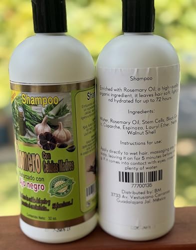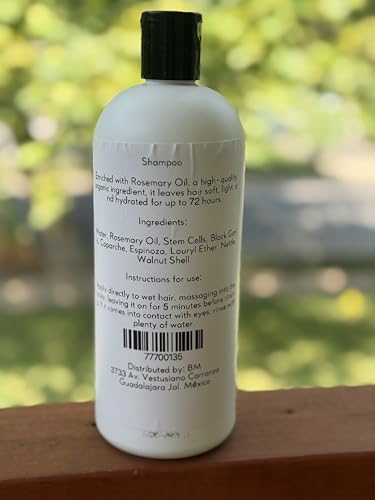Discover the power of natural hair care with this organic rosemary and black garlic enriched shampoo. This unique 32 oz formula combines traditional ingredients to help maintain healthy, hydrated hair for up to 72 hours. The specialized blend includes rosemary oil, stem cells, and walnut shell extract to nourish your scalp and strands. Easy to use - simply apply to wet hair, massage thoroughly, and leave on for 5 minutes before rinsing. The generous bottle size ensures you'll have plenty for multiple washes. Made in Guadalajara, Mexico, this shampoo brings together nature's finest ingredients for your hair care routine. Perfect for those seeking a natural approach to maintaining soft, manageable hair while supporting healthy growth patterns.