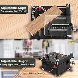 Mini Multifunctional Table Saw: This mini table saw combines cutting, sanding, engraving, and drilling functions, making it suitable for materials such as wood, acrylic, PCBs, plastics, aluminum, copper pipes, and cans. It comes with four different blade types, a drill clamp, a flexible shaft clamp, and numerous accessories for sanding, polishing, engraving, and drilling. This makes DIY crafting, model making, and more easy and convenient. Four Different Circular Saw Blades: The mini table saw set includes four different blade types: a PCB cutting blade, a high-speed steel saw blade, an alloy saw blade, and a resin saw blade. The blades have diameters of 2.36/2.48 inches and a bore of 0.62 inches. It can cut metal, wood, plastic, glass, ceramic, stone, and more, meeting various cutting needs. Adjustable Height: The mini table saw for crafts features a height adjustment function with a range of 0-15 mm. The adjustable blade allows precise adjustment of cutting depth based on material thickness, ensuring optimal cutting quality and precision. If the saw blade is held too high during cutting, it could cause a flying blade and other safety hazards. The height-adjustable saw blade allows you to adjust to the desired workpiece height, minimizing the exposed length of the blade and reducing operational risks. Adjustable Cutting Angle: The miniature table saw's cutting plate can be rotated between 0 and 90 degrees to suit the desired shape. The clear markings on the front panel of the portable table saw allow for precise control of the cutting angle, minimizing cutting errors and ensuring high-quality cuts, allowing you to achieve precise angles on your workpieces. Compact and Portable Design: Measuring only 7.1 inches x 6.3 inches x 4.3 inches, this portable mini table saw is compact, lightweight, and easy to carry. It can be easily moved to any location. With this versatile mini table saw, you can easily create models, DIY projects, and more.