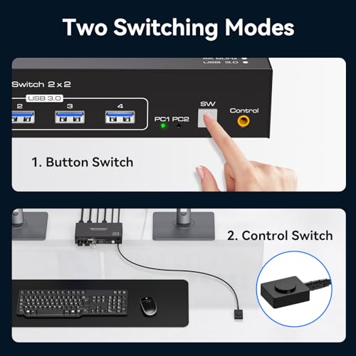 - 【The KVM Switch 2 In 2 Out Has Two Switching Way】The HDMI KVM Switches supports panel button and external wire controller switching.With two simple push-button options, switching between sources becomes effortless. Using the wired extension button, you can place the KVM outside the work area, making your desktop cleaner and tidier.Or just press the panel button next to the indicator light to achieve one-click switching,Simple, quick and easy to use, Let you can save more time to do other things!NOTE: Keyboard shortcuts (hotkeys) toggles are not supported