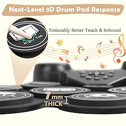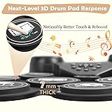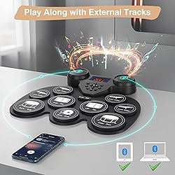 1️⃣ VIBRANT COLORFUL LIGHTS: Each drum pad lights up with every strike, cycling through red, yellow, blue, green, cyan, and purple. Dynamic lighting sparks kids' interest, keeping them engaged and excited to play. 2️⃣ ENHANCED REBOUND FEEL: Silicone pads with an improved design offer a noticeably better touch and rebound. Every strike bursts with energy and joy, helping beginners feel rhythm and master the beat. 3️⃣ DUAL STEREO SPEAKERS: It delivers rich, immersive sound. Connect via Bluetooth or Line-In port to external audio devices for tracks or rhythms. Plug in a headphone for practice without disturbing others. 4️⃣ PLAY ACROSS DEVICES: Connect your electronic drum set via Bluetooth MIDI to a computer, phone, or tablet. Create beats, play MIDI games, or compose tracks using MIDI apps for even more fun. 5️⃣ READY-TO-PLAY GIFT: Enjoy up to 10 hours of playtime on a single charge. Just connect the pedal line to drum kit and play. It’s a great interactive gift for kids, beginners, and families who love music.