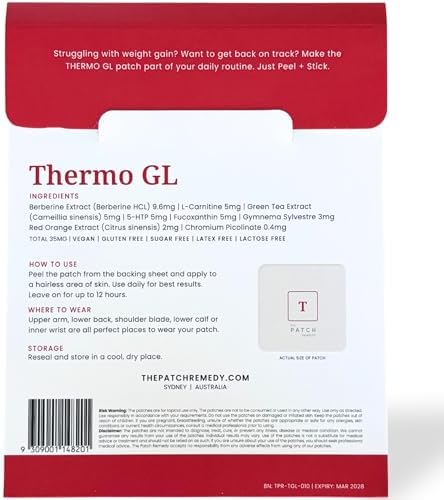 - THERMO GL PATCH INGREDIENTS – Contains Berberine Extract (Berberine HCL), L-Carnitine, Green Tea Extract (Camellia sinensis), 5-HTP, Fucoxanthin, Gymnema Sylvestre, Red Orange Extract (Citrus sinensis), and Chromium Picolinate. Created as part of a simple peel-and-stick approach.