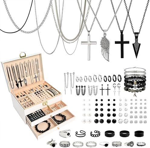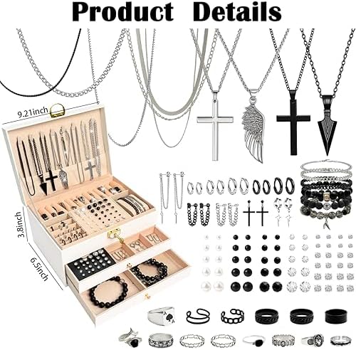 SMUOBT Jewelry Box with Jewelry Set for Women Men - Large Multi-Layer Jewelry Organizer Storage Case with Drawers, Necklace Bracelet Hoop/Stud Earrings Rings Gift Set for Her Him, Unique Birthday Party Gift (Gold/Black Silver)