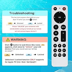 📺【Seamless Compatibility】Replacement Remote for Apple TV 4K/ Gen 1 2 3 4/ HD : For Apple TV A1218(1st Gen), for Apple TV A1378(2nd Gen), for Apple TV A1427/A1469(3rd Gen). For Apple TV HD A1625(4th gen), for Apple TV HD MHY93LL/A(5th gen). For Apple TV 4K A1842(1st Gen), for Apple TV 4K A2169(2nd Gen), for Apple TV 4K A2737/A2843(3rd Gen) 📺【Remote Compatibility】Replacement IR remote compatible with Apple TV Remote (white) A1156 MA128LL/A, for Apple TV Remote (aluminum) MM4T2AM/A. For Siri Remote (1st Gen)/Apple TV Remote (1st Gen) MQGD2LL/A, for Siri Remote (2nd Gen)/Apple TV Remote (2nd Gen) MJFM3LL/A, for Siri Remote(3rd Gen) /Apple TV Remote (3rd Gen) MNC73AM/A 📺【Note】This is an IR remote. NO Siri remote function, NO Voice control function, NO Touchpad function. The power/volume/mute buttons could only works for Vizio/ TCL/ Hisense/ Insignia/ Westinghouse/ Roku TVs. Please veryfy your TV is above brand of TV before you make purchase. Otherwise, only partial function will work. Please "UNLOCK" your old device with remote before using our remote, or our remote will not connect to your device!!! 📺【Easy to Use】NO more worry on pairing. Just need to insert 2*AAA remote and it's ready for use. To start using this remote, please change your input/ source to your Apple TV channel. Or press the menu button to activate your Apple TV. 📺【Packing Included】Comes with user manual. Package includes 1*Replacement and 1*User Manual. Batteries are NOT included.