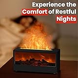FIREPLACE FLAME DESIGN: Features a realistic simulated flame screen that creates a cozy fireplace-like ambiance while functioning as a diffuser and humidifier for your living space AROMATHERAPY FUNCTION: Designed for use with essential oils to create soothing aromas that help relieve fatigue and promote relaxation in your bedroom, office, or yoga space CUSTOMIZABLE LIGHTING: Includes 7 color options with breathing effect or steady glow modes to create the perfect atmosphere for any mood or setting QUIET OPERATION: Ultrasonic technology produces fine mist while maintaining noise levels under 35dB, ensuring peaceful operation that won't disturb your activities SMART FEATURES: 160ml water capacity provides up to 10 hours of continuous mist, with convenient timer settings (1H/3H/5H) and automatic shut-off for safety