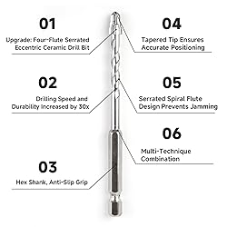 High Quality Drill Bits: Concrete drill bit set are made of alloy steel and high carbon steel material with carbide tip. Four-flute serrated drill bit increases wear-resistance, durability and extra longer life span, so that the drill bits last through multiple uses. 5 Pieces Drill Bit Set: Masonry drill bits for concrete includes 5PCS with diameter x flute Length sizes 1/4" x 2-1/4", 1/4" x 2-1/4", 5/16" x 2-1/4", 3/8" x 3" and 1/2" x 3". Easily meet your drill needs. Carbide Drill Bit: Industrial strength carbide drill bit tip, excellent abrasion resistance and easy hole positioning. Suitable for dry drilling. Fine-toothed serrated fast drill designed to provide maximum cutting power and accuracy. Easy to Install and Use: With anti-slip grip hex shank allows drill bit to be held tightly and stably in power drill. Compatible with most common drills, electric hand tool, machine tool, charging tool and bench tool, easy to install and remove and more secure. Widely Application: Masonry drill bits, ideal for drilling holes in bathroom tiles or walls. It can easily drill holes on wood, glass, marble, concrete and wall tiles, providing longer life and strength carbide drill bit tip work with wall tiles.