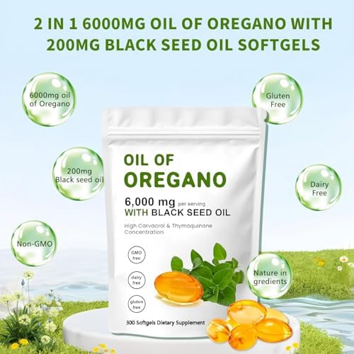 Oil of Oregano Softgels, 300 Count Organic Oregano Oil Supplement Capsules, Non-GMO, 6000 mg Oregano Oil and 200 mg Black Seed Oil