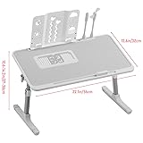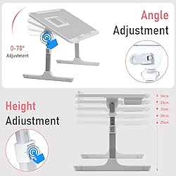 Multiple Adjustable Heights & Angles: Two auto-lock buttons on each side easily enable quick changes in height, legs can be set to 5 different heights (adjustable from 10.2"-14.2") in addition two clamps may be used to adjust the surface angle, surface can be set to different angles (from 0-36 degree). Wide & non-slip Desktop Design: Super large bed tray table size is 22"x12.6". High-density plate desktop to increase table friction and provide you the best anti-slip effect. Allows you to learn with peace of mind, without worrying about your book or computer falling off because the desktop is too smooth. Eco-Friendly Design & Robust Features: The lap desk is constructed from sustainable plate type, ensuring durability and eco-friendliness. It features a convenient drawer, a book holder, dual adjustable laptop stoppers, an integrated cooling fan, an adjustable table lamp, a compact fan, and smooth-rolling sled legs. Foldable Design: Light but sturdy, folds flat for space-saving storage and portability. Executive office solutions, set up your lap top or writing work station anywhere in your home or office. Multipurpose & Space-Efficient: Ideal for a range of activities from work and meals to relaxation and recreation. This foldable laptop table is a compact and versatile solution. When not in use, it easily folds, perfect for sliding under a bed or couch. It's a practical addition to any home, offering a multifunctional space for everyday needs.