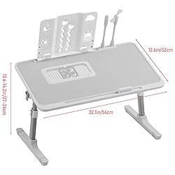 - Item Name: Bed Desk Material: Plate Type Adjustable Heights: 5 Level Features: Foldable, Wide Desktop, with Light Fan Size Details: L: 56cm/22.05", W: 32cm/12.6", H: 26cm-36cm/10.24"-14.18" (Approx.) Notes: Due to the light and screen setting difference, the item's color may be slightly different from the pictures. Please allow slight dimension difference due to different manual measurement. Package Includes: 1 x Bed Desk