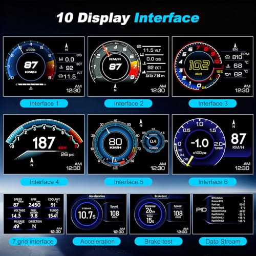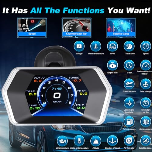 - COMPREHENSIVE REAL-TIME DATA DISPLAY: Monitor over 20 essential driving parameters including vehicle speed engine RPM coolant temperature battery voltage instant and average fuel consumption altitude driving time and distance turbo pressure intake pressure oil temperature navigation coordinates and satellite information All data is clearly displayed on the bright LCD screen for easy viewing