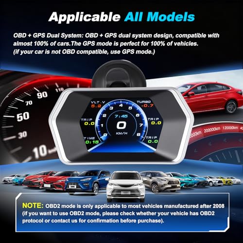 - DUAL SYSTEM UNIVERSAL COMPATIBILITY: This advanced HUD features both OBD2 and GPS connectivity for maximum vehicle compatibility OBD2 mode works with most vehicles manufactured after 2008 while GPS mode provides 100% compatibility with any vehicle including older models motorcycles and specialty vehicles The system automatically switches between modes for seamless operation