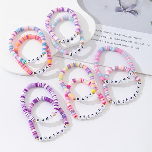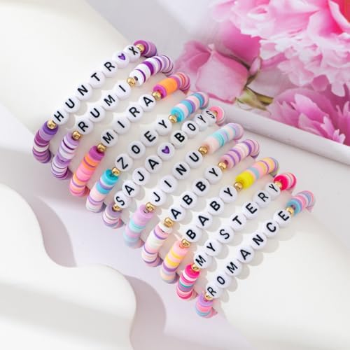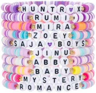 Express your fandom with these charming fmsao bead bracelets, perfect for collectors and enthusiasts! This delightful set includes 10 unique bracelets featuring names and terms from your favorite series, each crafted with colorful polymer disc beads in pastel purples, pinks, blues, and yellows. The bracelets measure approximately 2.36 inches (6cm) in diameter and feature white letter beads with black text, accented by gold-toned spacer beads for an extra touch of style. Each bracelet combines comfort with fashion through its lightweight design and stretchy construction, making them perfect for daily wear. The set includes various themed names like 'HUNTRX', 'MIRA', 'ZOEY', and more, allowing you to mix and match or share with friends. These trendy accessories are ideal for showing off your devotion to the series, making them great conversation starters or collectibles for fans of all ages.