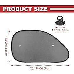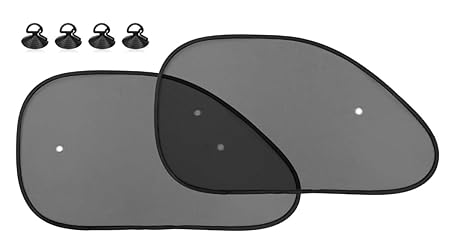 - Universal Fit and Easy InstallationDesigned with stretchable, elastic edges, these sun shades install in minutes and fit most car side windows. Includes 4 powerful suction cups for a secure, hassle-free setup.Superior Sun ProtectionCrafted from high-density polyester mesh, the shades block harmful UV rays, reduce heat, and minimize glare—keeping your car interior cooler and safeguarding passengers (especially children) during travel.Durable and Safe MaterialMade of quality black polyester for long-lasting use, the shades maintain clear visibility while driving. Lightweight yet sturdy, they resist wear for repeated trips.Package Includes2 × auto sunshades, 4 × suction cups.NoteSlight size variations may occur due to manual measurement. Color tones may differ slightly based on screen displays.