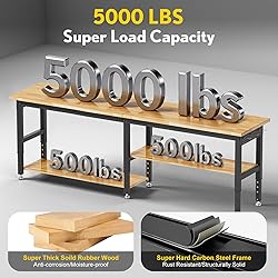 TWO-TIER WORKBENCH: This workbench features a practical two-level design, offering plenty of storage space. The two lower wooden shelves can be configured in six different ways to accommodate your DIY needs and available space. Perfect for organizing tools, equipment, and parts of various sizes and heights. SOLID RUBBER WOOD & REINFORCED STEEL FRAME: Featuring a 84” x 24” x 1.2” solid rubberwood top and an upgraded all-metal frame, this heavy-duty workbench supports over 6,000 lbs. Added support bars provide enhanced stability for demanding workspaces. INTEGRATED PEGBOARD & ETL-CERTIFIED POWER OUTLET: This workbench includes built-in pegboards on both sides, complete with 20 complimentary hooks for efficient tool and accessory organization. Keep your workspace clutter-free and make the most of your bench’s functionality. It also features an ETL-certified power strip with an on/off switch, 4 AC outlets, 2 USB ports, and a 9.8-foot power cord—allowing you to safely run power tools and charge devices simultaneously. No need to buy extra power accessories—everything’s included. 6-LEVEL HEIGHT ADJUSTMENT: Easily switch between six different heights—from 28 to 40 inches—with no tools required. Whether you prefer to work standing or seated, find your ideal position for maximum comfort and reduced strain. SETUP & SUPPORT: Your workbench comes with clear instructions and all necessary hardware for quick and easy assembly. The adjustable leveling feet ensure stability even on uneven floors. Versatile enough for your garage, workshop, or even as a computer desk, study table, dining table, or storage solution. We're committed to your satisfaction—if you have any questions, just reach out. We're here to help!