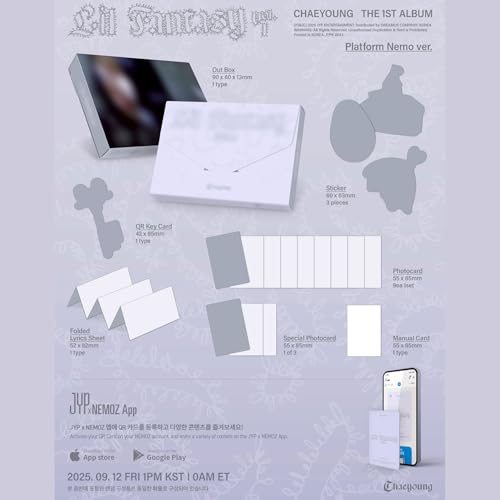 ✱════════════════════════✱ This is an QR Card album for mobile content that does not contain CD. This is a new type of album that you can enjoy using a smartphone app, and it may be smaller and have fewer components than you think. ✱════════════════════════✱ Made from Korea, Republic of Officially distributed Brand New & Factory Sealed. Will be Count Towards Hanteo and Gaon Chart. ───────────────────────── ♡ CHAEYOUNG - The 1st Album [LIL FANTASY vol.1] ───────────────────────── [ FEATURES ] □ Release Date ■ 2025.09.12 ───────────────────────── □ Version ■ Platform Nemo Ver. ───────────────────────── □ Components ■ Out Box ■ Sticker (3pieces) ■ QR Key Card ■ Photocard (9ea,1set) ■ Folded Lyrics Sheet ■ Special Photocard (1 of 3,Random) ■ Manual Card ───────────────────────── □ GIFT ❤ ■ 5 Extra Photo Cards - gift's image may change without notice.