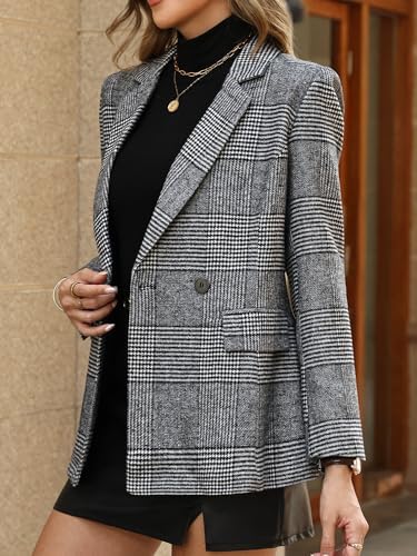 ELLEVEN Women's Houndstooth Plaid Tweed Blazer, Casual Trendy Double-Breasted Suit Jacket with Pockets Fully Lined