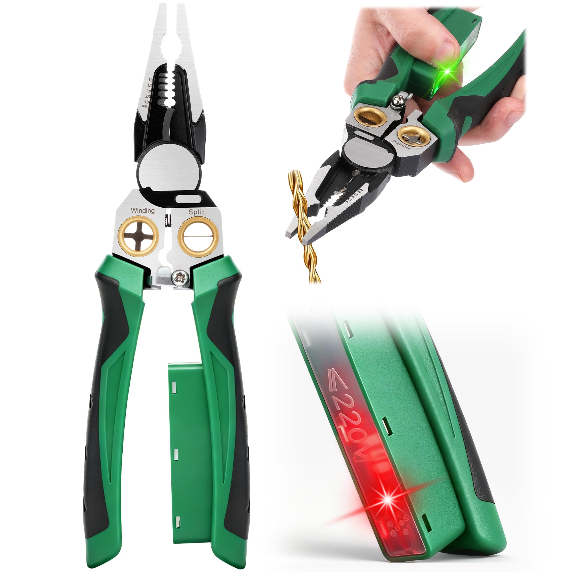 - [ 8-in-1 Multi-Function ]: Wire stripping, crimping, cutting, and voltage testing. No need to carry multiple tools—perfect for electricians, DIY enthusiasts, or home repair projects.