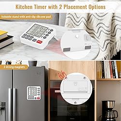 【4 Channels Count Up/Down Timer】: 4 events can be counted up & down simultaneously. Max time up to 99 Hours, 59 minutes and 59 Seconds. Perfect timer for cooking, barbecue, baking, exercise, gym workout, sports, homework, lab, kids’ activities and meetings 【Shortcut Key Setting & Easy to Use】Our digital kitchen timer has 10M, 5M and 10S shortcut keys, and it is fast to set the countdown time you want. Meanwhile Press "RESET" to set to ZERO, and then start timing! Simple and easy button design, kids also can use it without thinking 【Large Display & On/Off Function】The 4groups cooking timer with screen protector and high contrast large display provides a clearer bold numbers, which make it easier to read. And the multi timer also has On/Off function, you can turn the toggle switch on the back to the far left to shut it down 【Adjustable Volume & Flashing Light】Easy to adjust alarm volume by toggle switch (SOUND/ MUTE) basing on your requirement. Four sets of time correspond to four different colors of lights: blue, green, orange, and red. The flashing reminder will be displayed at the end of the time 【Two Placement Options】The 4 channels kitchen timer has strong magnetic back and foldable stand. It is convenient to place it on the desk table and set in one hand, and also works fine on the refrigerator for its 3strong magnets