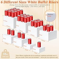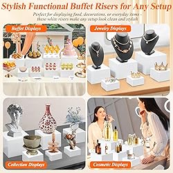 Warm Reminder: Please double-check the size details before purchasing to ensure it meets your needs Complete 8-Piece Buffet Risers Set with Accessories: This 8 pcs white buffet risers set includes sizes 4×4×2 in (2 pcs), 4.9×4.9×3 in (2 pcs), 5.9×5.9×4 in, 6.9×6.9×5 in, 7.9×7.9×6 in, and 8.8×8.8×6.5 in. The package also bonus 8 mini table signs, 8 colored markers, and 1 serving tong. Ideal for weddings, parties, or dessert buffets, these food display risers for parties enhance your buffet risers and collection Bonus 8 Mini Table Signs 8 Colored Markers & 1 Serving Tongs: Add a personal touch to your display with mini L-shaped table signs and colored markers. Ideal for labeling dishes, drinks, or décor, these accessories pair perfectly with white acrylic risers, making it easy for guests to identify items while enhancing your buffet setup. Serving tongs made of durable stainless steel with a soft silicone handle for a secure grip — perfect for parties, cooking, or serving indoors and outdoors Premium White Buffer Risers for a Modern Look: Crafted from high-quality, one-piece molded white acrylic risers with an upgraded 0.12-inch thickness, these white risers display stands that are strong, stable, and built to last. The surface holds plates, bowls, or glassware securely, making them reliable food risers for a buffet table or food display stands for buffet. Their sleek, polished finish ensures your presentation looks flawless for any event Versatile Food Risers for Buffet and More: These food risers for buffet tables feature a smart hollow-bottom design for dual use—stand them upright for food presentation or flip them for convenient storage. Their minimalist aesthetic suits any setting: perfect for food risers for a display party, desserts, jewelry, cosmetics, or collectibles. Ideal for restaurants, weddings, art shows, bakeries, and home décor, they are truly white buffet risers that blend function with beauty Buffet Risers with 2-in-1 Storage & Display Design: Buffet risers crafted in varying sizes. They add height, dimension, and style to your table, perfect for food display risers for parties and dessert risers. Featuring a smart hollow-bottom cube design, they can be flipped for dual use, stand upright as sturdy food risers for a buffet, or turned over for space-saving storage. They nest neatly when not in use, keeping your area organized while adding a clean, professional touch to any event