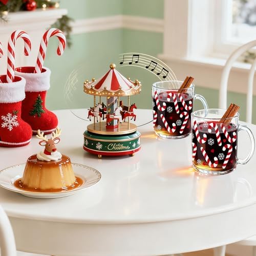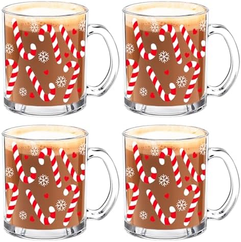 Whaline 4Pcs Christmas Glass Coffee Mugs with Handle Red White Xmas Candy Cane Coffee Cups Beverage Mugs for Hot Cold Drinks Home Winter Holiday Party
