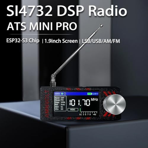 Specification:Origin: Mainland ChinaAdvantages after upgrading:1. Brand-new system: supports brightness adjustment (for outdoor use), bandwidth adjustment and other functions,2. Brand-new hardware: supports independent headphone amplifier circuit, and the headphone listening volume is higher3. High-quality production process: some manufacturers mixed inferior accessories in the old version, and we use all new parts for productionParameters:Model: ATS MINI PROMaster control: ESP-32-S3Working mode: FM/AM/LSB/USB (note, does not support aviation band)Receiving band: HF/SW/MW/VHFFrequency range: LW, MW, SW (150kHz - 30MHz), VHF (64-108Mhz)Screen: 1.9inch, 170*320 resolutionCharging port: TYPE-C (cannot use fast charging)Audio interface: 3.5mm three-band stereoAntenna interface: SMA-KE (inner hole)Battery capacity: 800maProduct size: about 73.00x32.00x12.00mmProduct size: 2.87x1.26x0.47inch Note:Due to different monitor settings and lighting conditions, the actual color of the item may vary slightly from the pictures. Thanks for your understanding!Please allow a 1-2 cm difference in measurements due to manual measuring.Package includes:1 x Mini Pocket Radio1 x Antenna1 x USB cable1 x Instruction manual