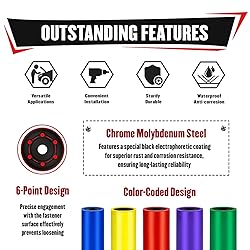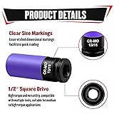- 【Premium Construction & Durable Coating】 Crafted from high-quality chrome molybdenum (Cr-Mo) steel, this socket set delivers superior strength, toughness, and wear resistance. It handles higher torque, withstands high-pressure/high-temperature environments, and features a special black electrophoretic coating—offering better rust and corrosion resistance for long-lasting performance. 【Complete Size Range with Easy Identification】 This 1/2" drive deep socket set includes both metric and SAE sizes to cover diverse needs: Metric (17mm, 19mm, 21mm) and SAE (13/16", 7/8"). Each socket is equipped with dual identification features—laser-etched size markings for quick reading, plus color coding—ensuring you find the right tool in seconds. 【6-Point Design & 360° Scratch Protection】 The high-torque 6-point opening clamps tightly on the flat sides of fasteners (not the corners), preventing rounded edges and bolt detachment during high-torque operations. It also comes with 360° scratch-resistant nylon sleeves and internal damage-free inserts, which protect rims, bolt tops, and lug nuts from scratches or damage, even in tight spaces. 【Versatile Compatibility & Wide Applications】 Works seamlessly with all 1/2" drive tools, including power tools, air tools, hand wrenches, and torque ratchets—suitable for both stock and aftermarket wheel bolts. Ideal for automotive repair, tire changes, racing/high-performance vehicle maintenance, hub assembly, and suspension system work, meeting professional and DIY needs alike. 【Portable Storage】 Comes in a sturdy, high-impact blow-molded storage case that keeps sockets organized, accessible, and protected during transport.