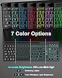 【LIGH UP WORK-LIFE 】The backlit wireless keyboard has 7 switchable backlights with an RGB mouse that automatically changes color (𝐁acklight can be turned off). Light-up keycaps and letters help you to use it more easily in low light and enhance typing accuracy. 【RECHARGEABLE & LONG BATTERY LIFE】Rechargeable keyboard and mouse can be charged by the supplied USB-C charging cable. The smart auto-sleep function and power switches are more environmentally friendly, helping you to save power. Idle for 1.5 mins, the keyboard light off, idle for 15 mins, the mouse will sleep and can be awakened by pressing any key. The wireless mouse and keyboard lasts weeks between one charge, saving you the expense and hassle of swapping batteries in and out. 【DUAL SYSTEM LAYOUT, NO DELAY】Switching between Mac and Windows systems is as easy as a single touch. Reliable 2.4G wireless technology, plug and play, enjoy lag-free. Keyboard and mouse use 𝐎𝐍𝐄 USB receiver, allowing wireless connection up to 33ft. 𝐍𝐎𝐓𝐄: 𝐓he 𝐔𝐒𝐁 receiver is stored in the back of the mouse. 【LESS NOISE, MORE FOCUS】Wireless keyboard features increased key stability that reduces noise and optimizes responsiveness so you feel, but don’t hear, every keystroke. The USB mouse features silent micro motion technology, making its clicks almost completely silent. Don't worry about disturbing others. 【MULTI-FUNCTIONAL DEVICE HOLDER】The light up keyboard is designed with a phone and tablet holder. Provides you with additional space to place your phone, tablet. You can easily view SMS or other information on your mobile phone without picking up the phone, which is convenient for charging, reading, etc. 【COMFORTABLE & EFFICIENT 】The wireless keyboard with foldable stands helps keep your hands cramp-free after a long day. The mouse comfortably fits the curve of your hand, and with 3 DPI settings (800/1200/1600) and forward/backward functionality, you can browse the web faster and easier than ever before. 【WIDE COMPATIBILITY& AFTER-SALES SERVICE】This backlit keyboard mouse combo works with your PC, Desktop, Laptop. Compatible with Windows, Linux, Chrome, and Mac. (Note: Multimedia keys are not be fully compatible with Mac OS systems) We promise that our product has a 12-month free after-sales service. Even after the Amazon return period, as long as you contact us, we will try our best to solve it for you. 𝐓𝐈𝐏𝐒: 1. When you receive the product, you need to fully charge the keyboard and mouse to help extend the battery life. 2.If you're experiencing delayed responses or sticky keys, it could be due to low battery voltage. To ensure smooth performance, please charge your keyboard and mouse fully before use. 3. If you do not use the keyboard and mouse for a long time, please turn off the power supply.
