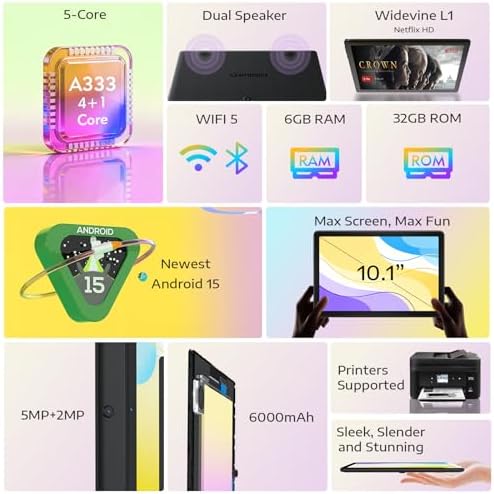 - 【Latest Android 15 & Powerful Performance】Stay ahead with the newest Android 15 OS, offering seamless access to millions of apps on the Google Play Store. Driven by a robust 5-core processor peaking at 1.75GHz, this tablet ensures fast, smooth performance for work, entertainment, and gaming.