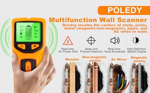 5 in 1 Stud Finder, Poledy Stud Detector - Precisely Locates the Center and Edge of Studs, Wall Scanner with Audio Alarm & Deep Scan Sensor for Wood, Metal Studs, Live AC Wires, Pipes & Joists