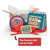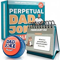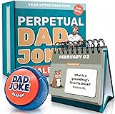 Gift Set Includes: (1) Perpetual Daily Dad Joke Calendar & (1) Talking Dad Joke Button. CLEAN JOKES FOR ALL AGES: Hilarious family-friendly jokes even the kids can enjoy! Just remove the battery tab and push the Dad Joke Button to get the eye rolling started! OVER 100 JOKES ON BUTTON: This dad joke button comes pre-loaded with over 100 of the silliest jokes guaranteed to get groans from family and friends! BUTTON: HIGH/LOW VOLUME ADJUSTMENT: With 2 volume settings you can enjoy in loud or quiet environments! BATTERIES INCLUDED: (2) AAA Batteries Included CALENDAR EASEL DISPLAY: Display it your way! Use the sturdy easel for your desk or tabletop, or hang it up easily with the built-in wall hook. Your jokes deserve a stage. CALENDAR DIMENSIONS: 5.75 inches wide x 5.25 inches tall. Perfect for desks, kitchens, man caves, classrooms, and anywhere else people pretend not to hear you.