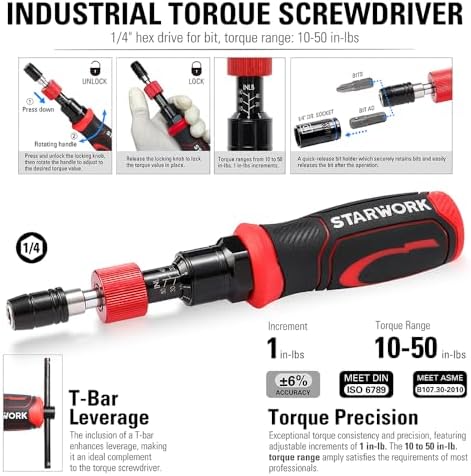 - 【1/4" Industrial Torque Screwdriver】Professional torque screwdriver with 1/4" hex drive, 10–50 in-lbs adjustable range in precise 1 in-lb increments, delivering ±6% accuracy with a quick-release bit holder and T-bar leverage for efficient, consistent, and reliable fastening performance.
