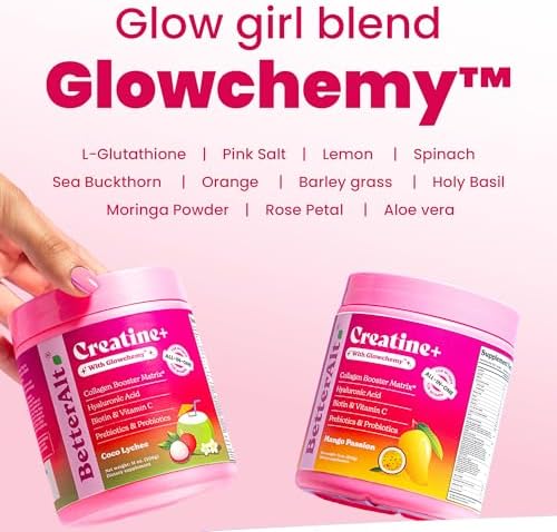 Better Alt Creatine Plus Glowchemy| Advance Collagen Builder Matrix, Hyaluronic Acid, Biotin & Vitmain c, Prebiotics | for Muscle Recovery & Skin Glow| All in One Formula for Women|Mango Flavor