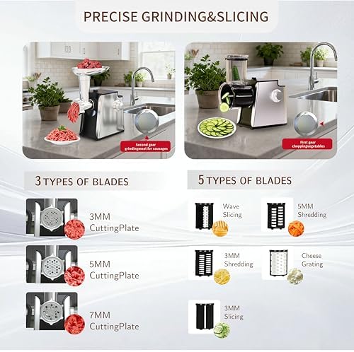 - Easy to clean: The stainless steel blades and plates and cutting blades are dishwasher safe, making cleaning quick and convenient. The multifunctional electric meat grinder and vegetable cutter is an ideal choice for busy households, ensuring hygiene and saving time. No more tedious cleaning - enjoy a worry-free cooking experience with this user-friendly design. Note: For best results, hand wash all attachments after use.