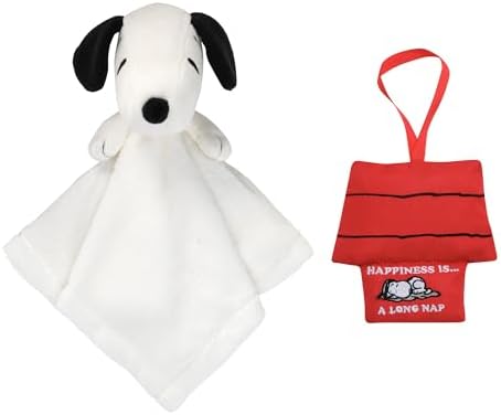 This officially licensed Snoopy two-piece gift set includes one security blanket/lovey and one door knob pillow embroidered with the words “Happiness is...A Long Nap.” The doorknob pillow features Snoopy’s iconic red dog house with Snoopy napping comfortably on his favorite blankie. The security blanket lovey is 12 inches by 12 inches and is made in a soft white coral fleece material. Snoopy’s head and arms are white velour, his eyes and brows are embroidered in black, and his nose and ears are black velour. He is wearing a red ribbon around his neck and makes the best baby shower gift or welcome home baby gift for any Peanuts fan.