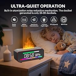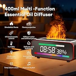 Flame Diffuser Humidifier:Experience a realistic fire effect with our fireplace diffusers for essential oils. The dynamic flame adds cozy warmth to any room while providing ultrasonic humidification, creating a perfect blend of ambiance and air comfort. Bluetooth Speaker & Music Rhythm Light:Connect your smartphone or tablet via Bluetooth to enjoy your favorite music. The bluetooth fire flame diffuser features a music-synced light mode, letting the flame and 7-color ambient lighting dance to your tunes for a fully immersive experience. Multifunction Clock & Alarm:Built-in digital clock and alarm features make this fireplace oil diffuser a practical bedside companion. Check time at a glance and wake up gently with mist, light, or sound, combining aromatherapy with smart daily functionality. Humidity Display & Long-Lasting Mist:The flame diffuser humidifier monitors real-time humidity, allowing you to maintain a healthy indoor environment. The 400ml water tank provides up to 12 hours of continuous mist, keeping your space comfortably hydrated without frequent refills. 7-Color Ambient & Safe Operation:The colorful fireplace diffuser offers seven vibrant lighting modes and auto shut-off when water is low. Ultra-quiet operation (<30dB) ensures peaceful sleep or focused work, making it ideal for bedrooms, offices, yoga studios, or home décor.
