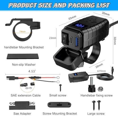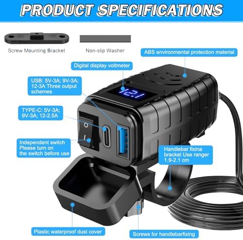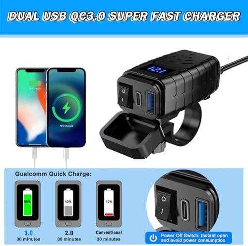 - ⚡【Super-Fast Dual Ports Charging】Equipped with both USB and Type-C ports, it's compatible with nearly all smartphones, action cameras, GPS navigators, and other devices on the market, allowing you to charge any electronic device while riding. Whether your phone runs low on battery during a long motorcycle trip or your GPS urgently needs a top-up, this charger can quickly recharge your device, allowing you to quickly get back to the fun of riding without waiting