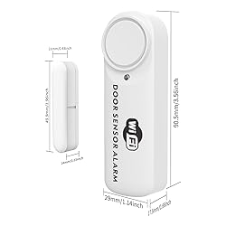 - 100dB Smart WiFi Alarm & Chime Loud 100dB siren instantly triggers when door/window opens, deterring burglars & alerting families. Real-Time App Alerts & Alexa Control Tuya/Smart Life app sends phone notifications on opening/closing. Voice control via Alexa/Google. Share with family for multi-user monitoring. Level Volume + 3 Alarm Modes Adjustable volume for kids safety (Alarm/APP Reminder/Silent mode). Perfect for apartments, pools, garages & hotels. Kid & Anti-Theft Protection Prevent children sneaking out & unauthorized entry. Strong 3M adhesive installs in seconds on doors/windows/cabinets (Spacing<0.6in). Low Battery App Alert & 24h Support The sensor door needs TWO AAA Batteries(Not included). When the battery is running out, you will receive an App notification, Don't worry about missing any moment.