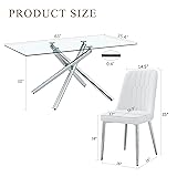 Practical for Small Spaces: Compact 51'' size makes the glass dining table set easy to fit into apartments, breakfast nooks, or smaller dining rooms, while still offering seating for 4 people Easy to Clean and Maintain: Smooth tempered glass surface and wipeable faux leather chairs allow quick cleaning after meals on this 5 piece dining table set, saving time and effort in daily use Comfortable Seating: Four ergonomic white leather chairs of the modern dining table set for 4 with supportive backrests, silver metal legs, and adjustable foot pads, which ensure comfort and stability. Each chair supports up to 250 lbs Durable Tempered Glass Tabletop: The sturdy glass top resists scratches and heat, keeping this glass kitchen table chairs set of 4 clear, bright look while safely supporting up to 300 lbs Stable Metal Legs: Silver crossed metal legs of the small dining table set for 4 feature adjustable foot pads for extra stability. Crafted from high-quality metal, they are rust-resistant and built to last