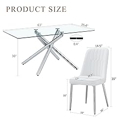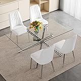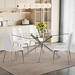 - Bring timeless style and functionality to your home with the glass dining table set for 4. Designed with a 51'' tempered glass tabletop and silver straight metal legs, this small dining table set is both durable and elegant, making it suitable for everyday meals or special occasions. The 5 piece dining table set includes four white faux leather chairs with supportive backrests. Each chair is built with sturdy silver metal legs and adjustable foot pads for added stability, supporting up to 250 lbs. The tempered glass tabletop resists scratches and heat, providing a reliable surface that safely supports up to 300 lbs. Compact in size, this modern dining table set for 4 is an excellent choice for apartments, breakfast nooks, and small dining spaces. With its clean lines and neutral design, this kitchen table and chairs set of 4 blends easily with a variety of interior styles. Whether used as a comedor de 4 sillas y mesa or a juego de comedor 4 sillas y mesa, this sliver glass dining table set offers a practical and lasting addition to your dining room.
