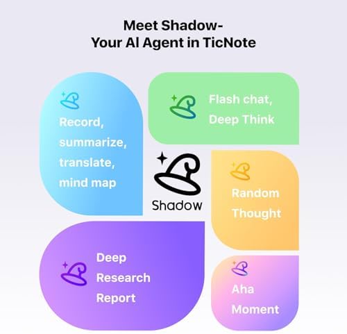 - 【AI Agent】Shadow is TicNote's built-in AI assistant that works seamlessly with hardware to help you think, organize. Chat with Shadow for quick answers or with Deep Think. Use online search for real-time insights. Capture Random Thoughts, whether as voice memos or written notes. For complex tasks, Deep Research helps you analyze your project’s files, past meetings all in one place. As you use TicNote, it learns from your workflow and proactively delivers Aha Moments-smart insights and creative s
