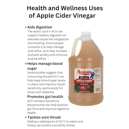 Discover the versatile benefits of Acclaim Gourmet Apple Cider Vinegar, available in a generous 1-gallon size perfect for both culinary and wellness applications. This premium vinegar is carefully diluted with water to achieve a 5% acidity level, making it ideal for various uses. Known for supporting digestive health, this apple cider vinegar can help with issues like indigestion and bloating when consumed as directed. Studies suggest it may assist in maintaining healthy blood sugar levels and improving insulin sensitivity when used as part of a balanced diet. The vinegar contains beneficial compounds that can help promote gut health by supporting natural digestive processes. For soothing relief from a scratchy throat, try mixing a tablespoon with warm water and honey. Beyond wellness applications, this versatile vinegar excels in cooking - use it to add tang to marinades, create flavorful dressings, or enhance your favorite recipes. The convenient gallon size ensures you'll have plenty on hand for all your culinary and wellness needs.