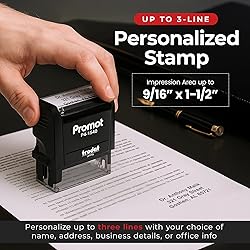 - Make every impression count with the Promot 3 Line Custom Text Stamp, designed for convenience, durability, and professional results. This stamp allows you to add up to three lines of custom text, making it ideal for names, addresses, office details, business information, or personal projects, and is especially useful as a return address stamp for daily mail or as a quick way to brand documents and forms. The built-in self-inking mechanism automatically re-inks after each press, delivering fast and efficient stamping without the need for a separate ink pad, while the precision-engineered rubber stamp surface ensures each impression is crisp, sharp, and easy to read, giving your envelopes, invoices, and packages a clean, professional look. The ink pad is also refillable, allowing for long-lasting use and reducing the need for frequent replacements. Its compact small-sized design makes the stamp lightweight, portable, and easy to handle, great for repetitive use at home, in the office, at school, or for small business needs, whether you’re processing daily mail, marking invoices, or stamping packages.
