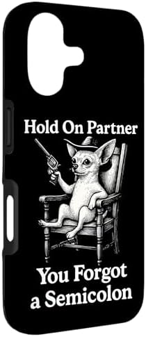 Funny cowboy chihuahua saying Hold on partner, you forgot a semicolon. Perfect for programmers, coders, and software developers who enjoy a humorous take on debugging, coding, and tech life. A fun way to show passion for technology and computer science.